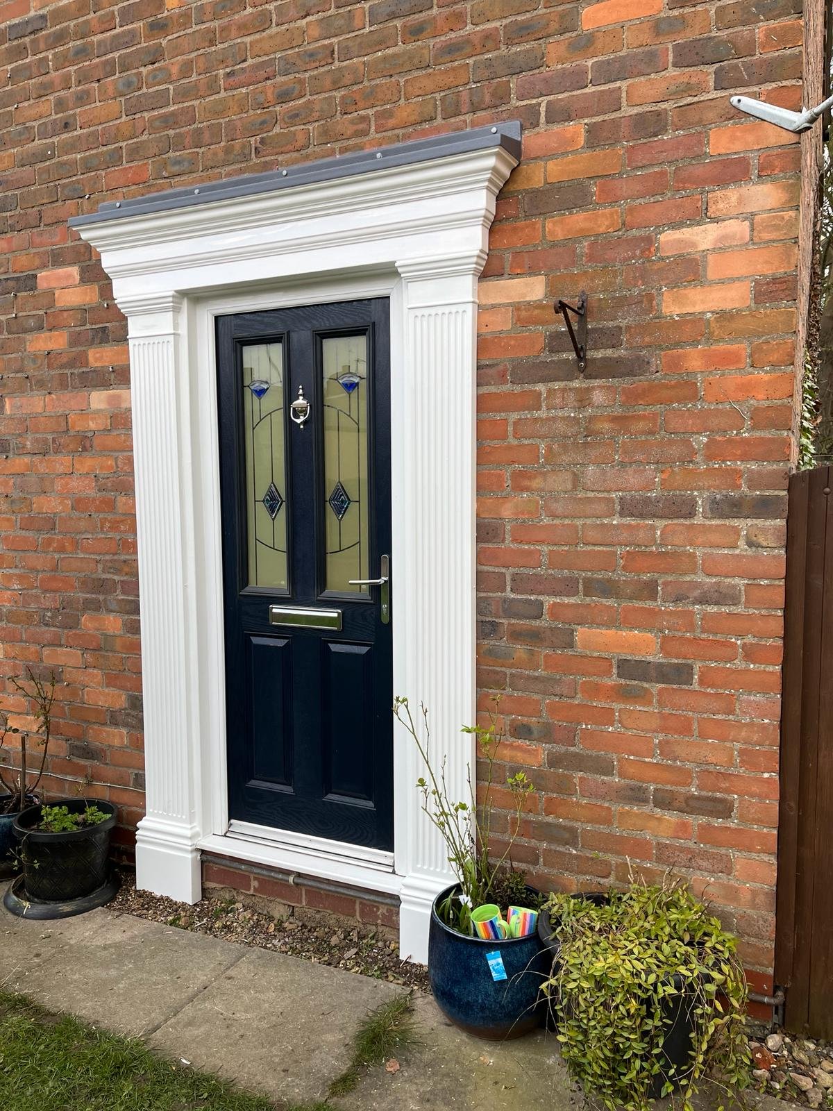 Its classic Georgian design features crisp detailing, a flat top canopy, and tall pillars that wrap around the doorway to create an elegant architectural finish.